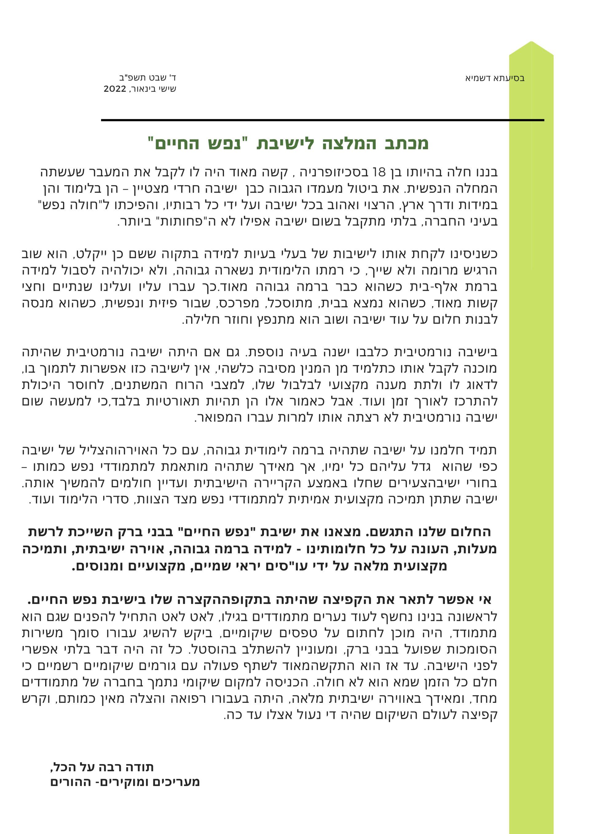 ישיבת "נפש החיים" בבני ברק הוקמה במטרה לתת מענה בסגנון ישיבתי, עבור בחורים צעירים (18-25), בעלי רקע תורני ישיבתי, המעוניינים להמשיך את הלימוד הישיבתי, במסגרת מתאימה לאורחות חייהם ומשפחותיהם.